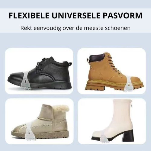 ✅ Universeel en altijd paraat – Past op élke schoen en zit compact in je tas. Klaar wanneer onverwachte gladheid toeslaat.